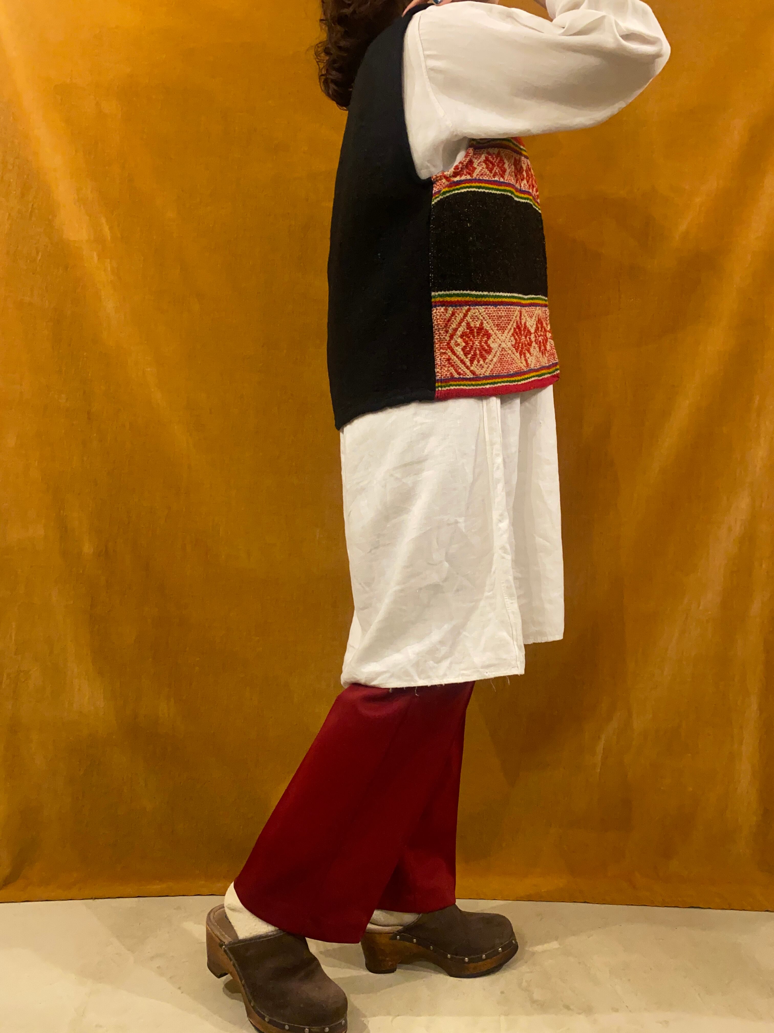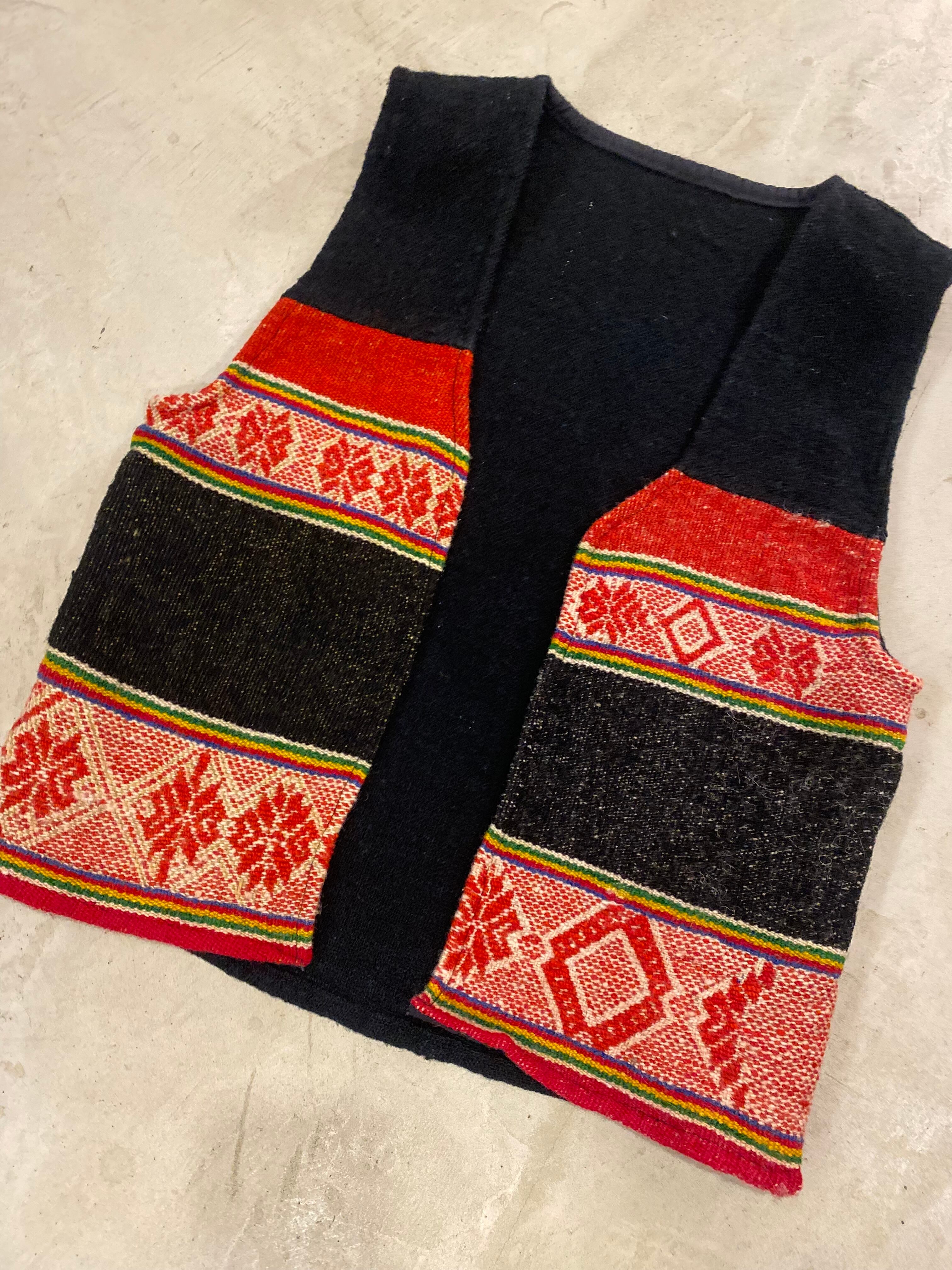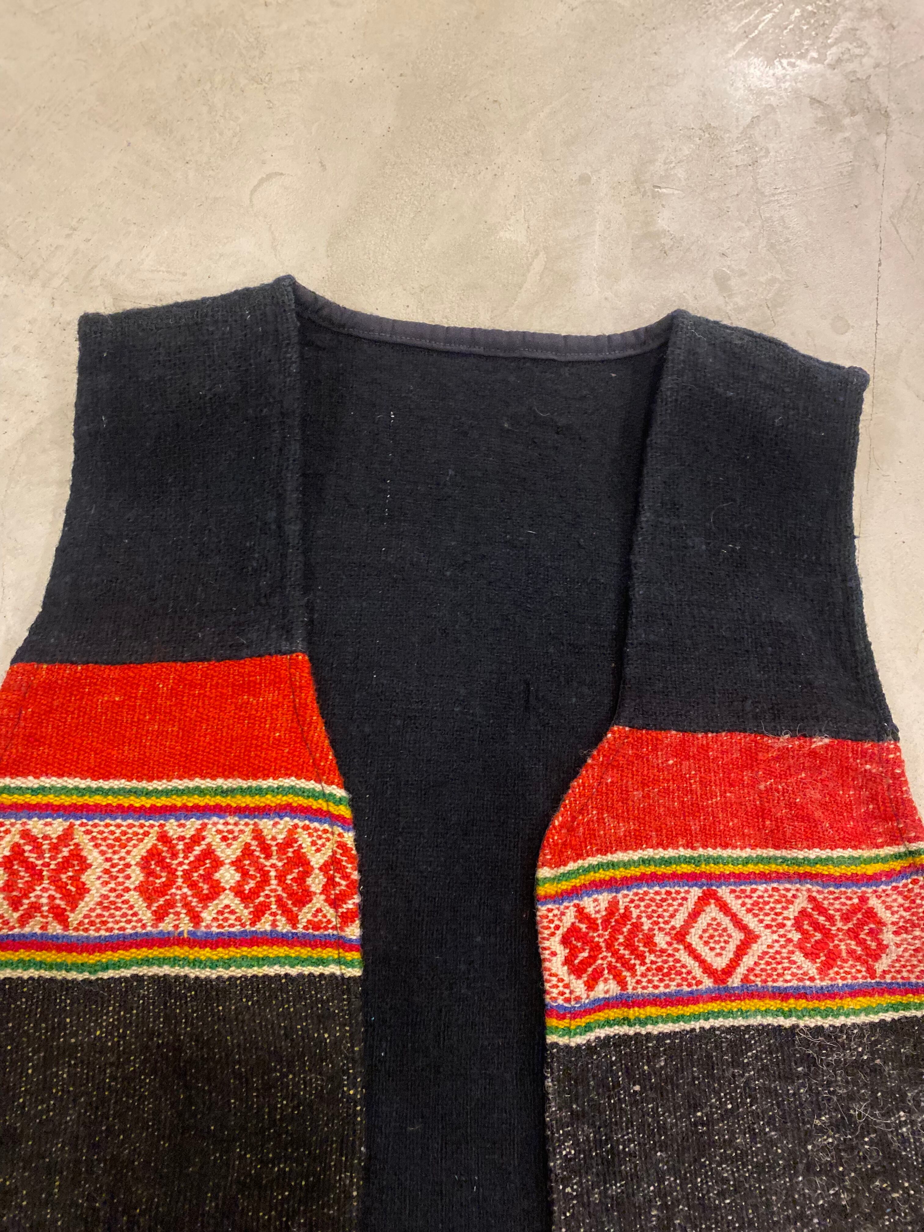 ブラック地に赤や黄色などカラフルな織のベスト