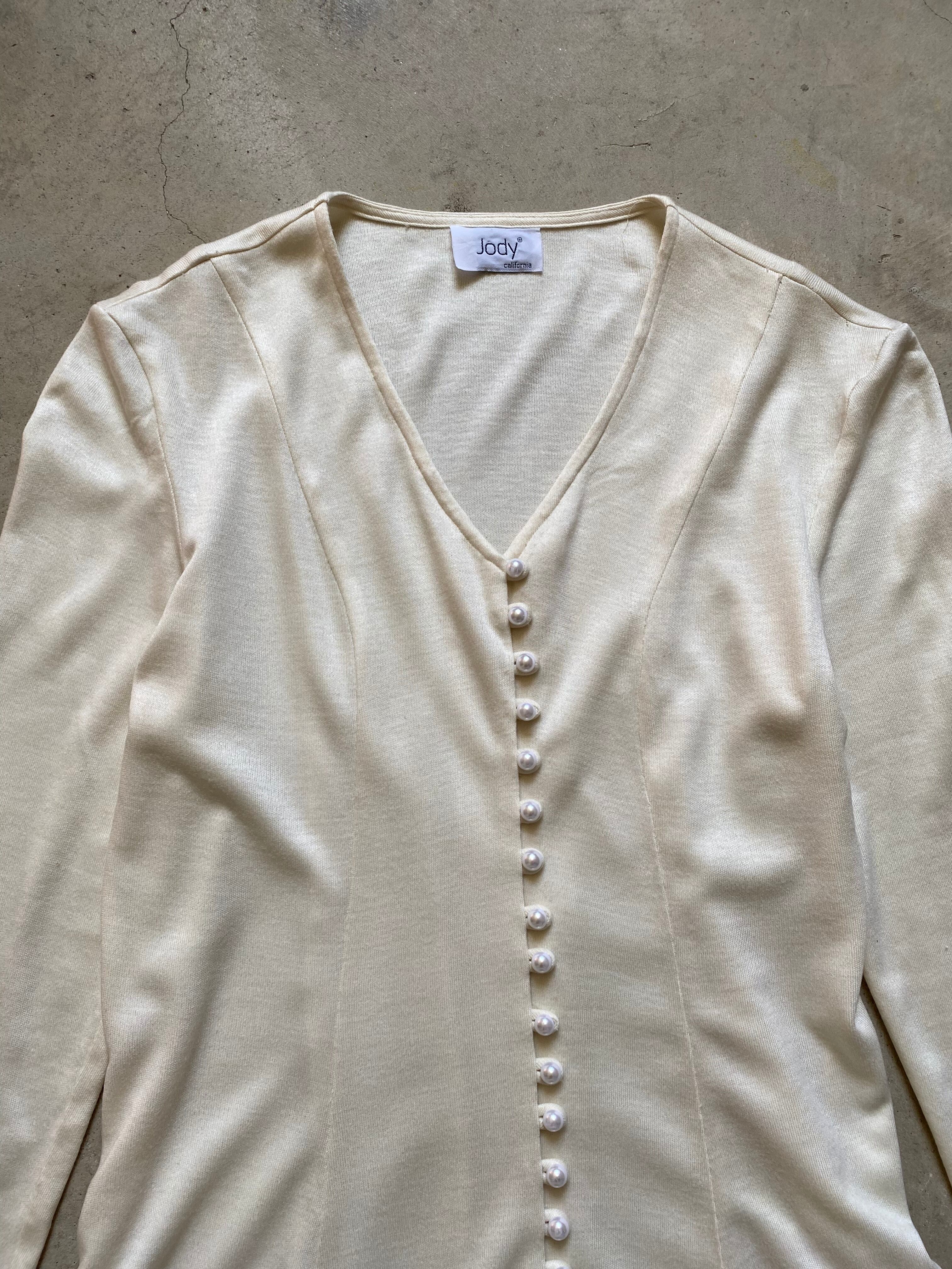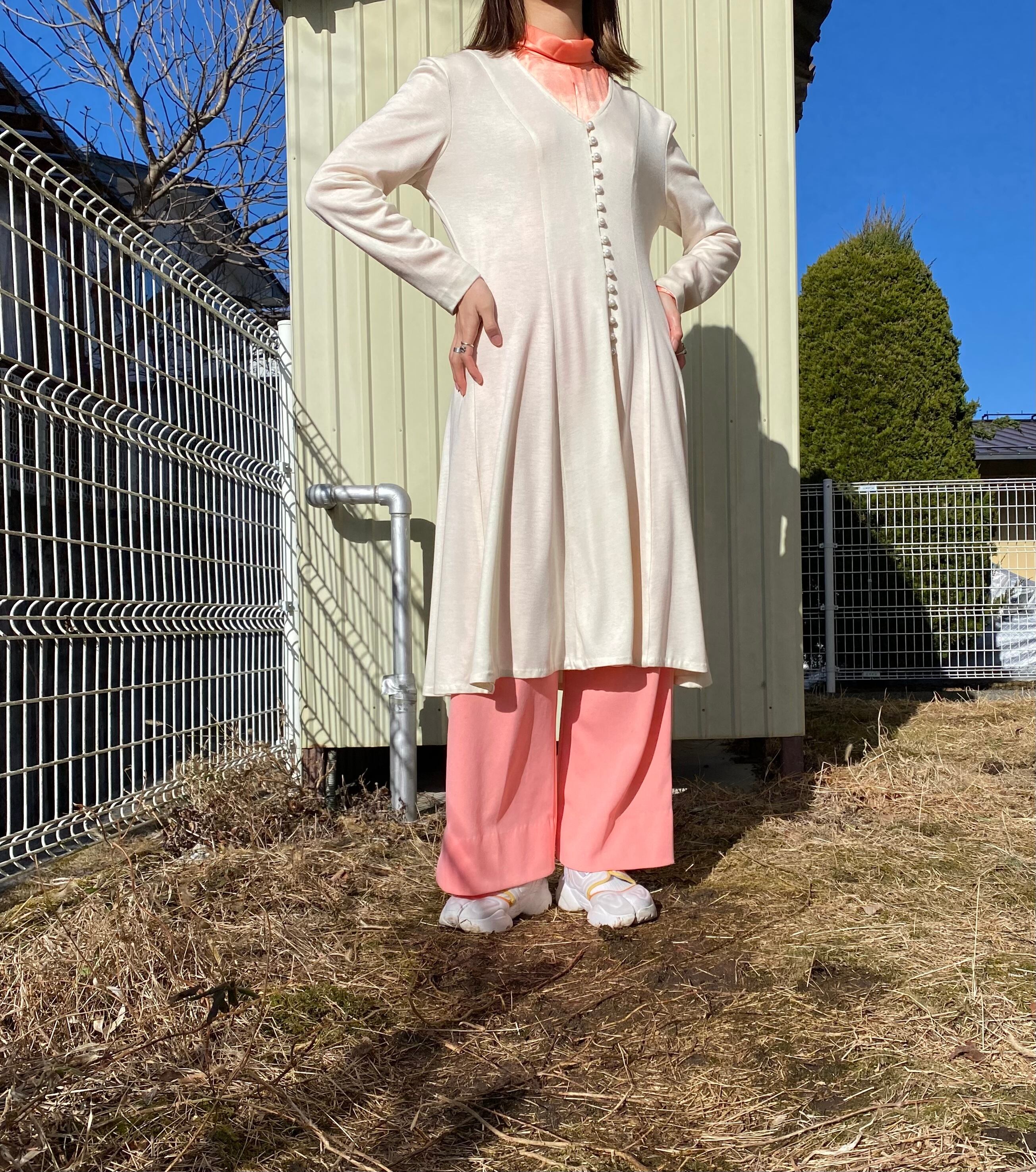 深めのVネックとパールのようなボタンが素敵です☺︎